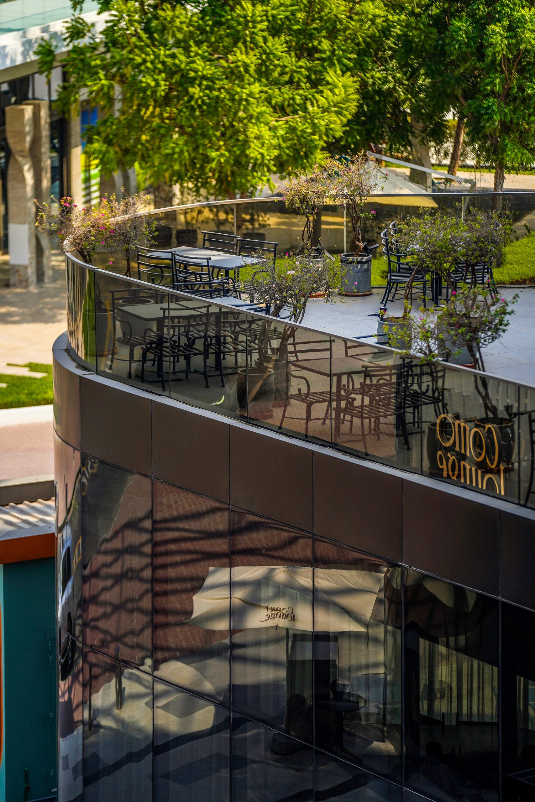 The design features a distinctive horseshoe-shaped layout and a sweeping custom-curved roof with a 25-metre span, forming an elegant glass skylight terrace above the central courtyard .